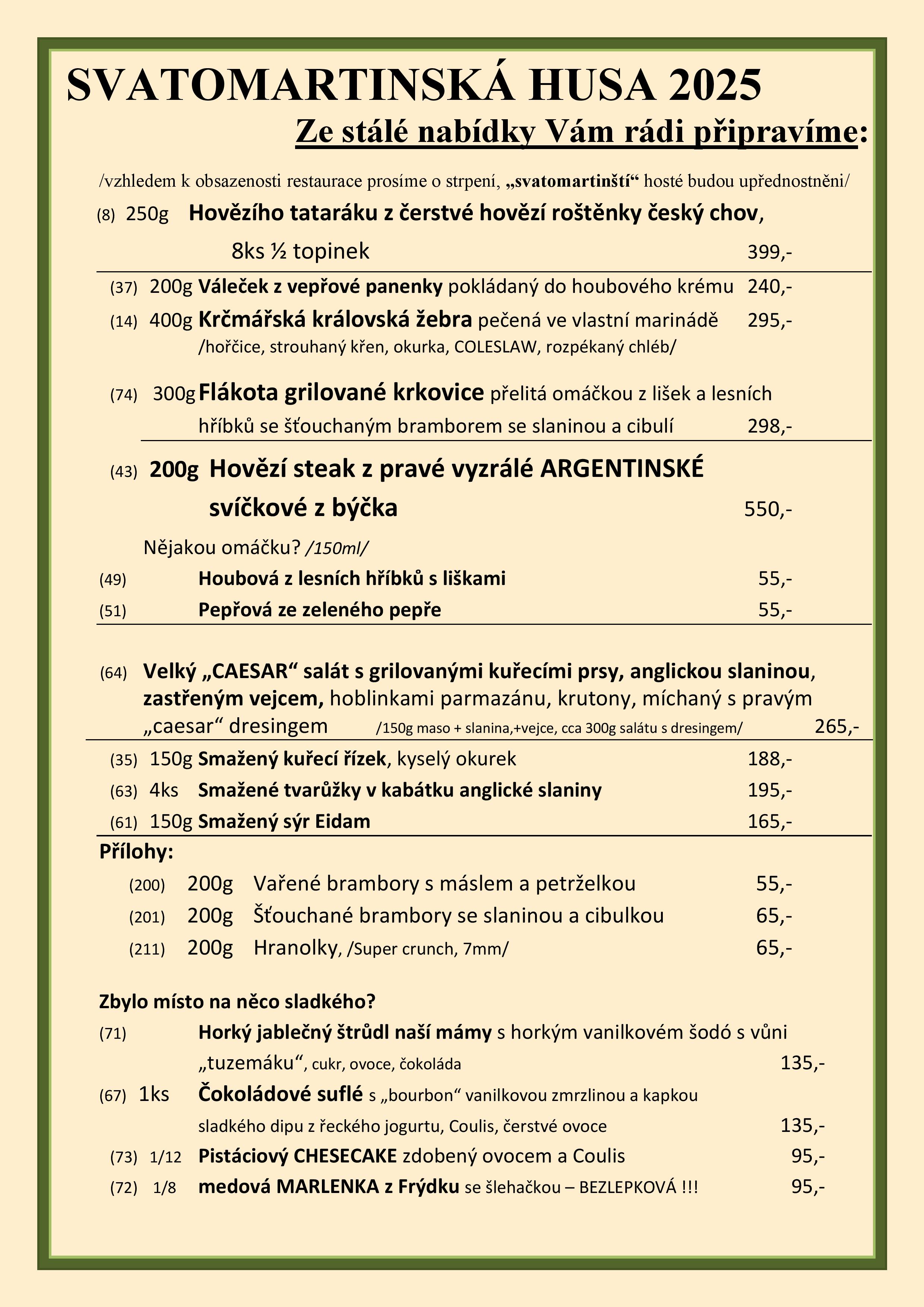 Jdeme cestou čerstvých a kvalitních surovin, cílíme na poctivou domácí a českou kuchyni a snažíme se obklopovat kolegy, kteří nejsou jen „zaměstnanci“, ale parťáci, kteří musejí mít stejný cíl = SPOKOJENÝ ZÁKAZNÍK.